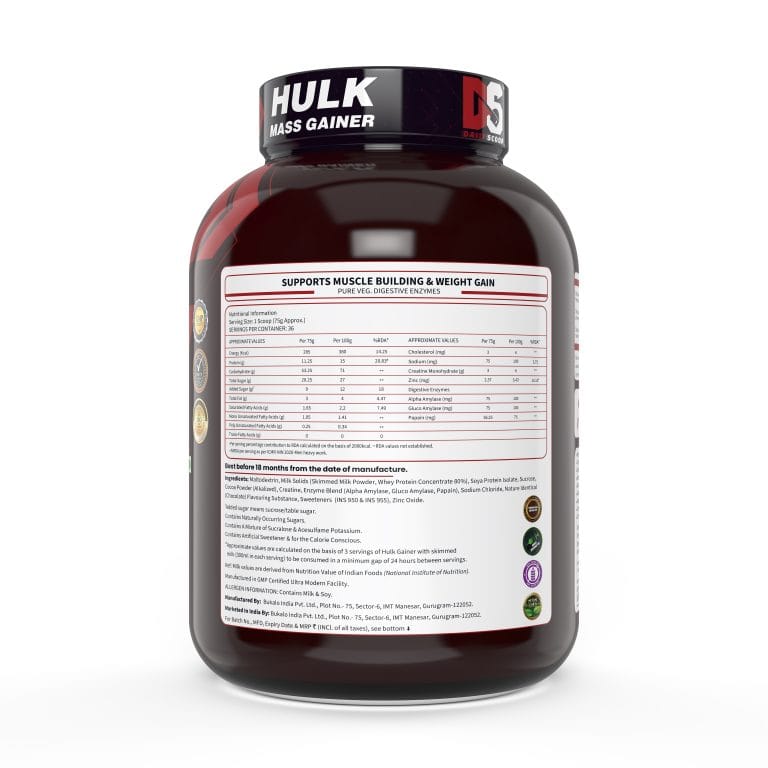 When your plan is to gain muscle mass, then DS Hulk Mass Gainer supplement is the best choice. it supports muscle growth and boost overall health. Hence, you can rely on this high protein mass gainer to achieve your fitness goals. It is formulated with ingredients that helps to speed up recovery, muscle growth and increase muscle size.