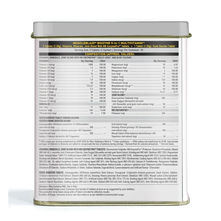 3. Joint Blend: When you are an advanced gym-goer, you have no room for joint discomfort, pain, or inflammation. The answer for your joint wellness is a wholesome joint blend. MuscleBlaze Biozyme Daily Multivitamin contains a perfect combination that assists in mobility, flexibility and upkeeps the health of your joints