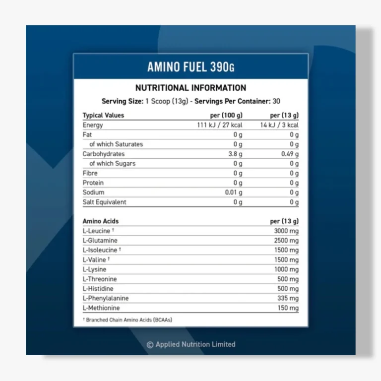 Amino Fuel is the perfect optimal blend delivering 11g of aminos per serving, 9g of which are Essential Amino Acids (EAA) including 6g of Branched Chain Amino Acids (BCAAs) at a 2:1:1 ratio (3000mg L-Leucine, 1500mg L-Isoleucine, 1500mg L-Valine) with an additional 2500mg of L-Glutamine. Amino Acids are complex chemicals that are the building blocks of protein. Essential Amino Acids (EAA) cannot be synthesised or created by the body and therefore must be supplied from the diet. Amino Fuel can be consumed 24 hours a day or when extra amino intake is required, such as any form of exercise or activity.