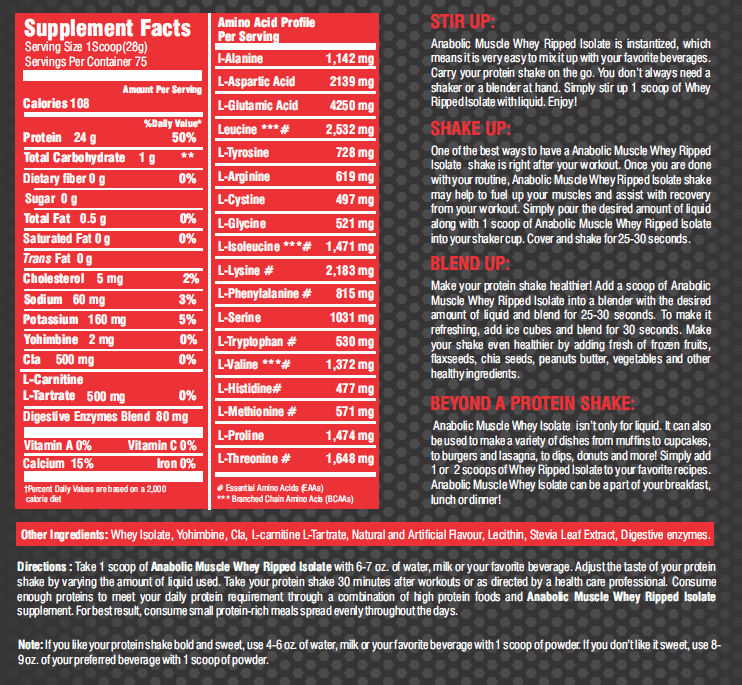 Beyond a Protein Shake: Anabolic Muscle Whey Isolate isn�t only for liquid. It can also be used to make a variety of dishes from muffins to cupcakes, to burgers and lasagna, to dips, donuts and more! Simply add 1 or 2 scoops of Whey Ripped Isolate to your favorite recipes. Anabolic Muscle Whey Isolate can be a part of your breakfast, lunch or dinner.